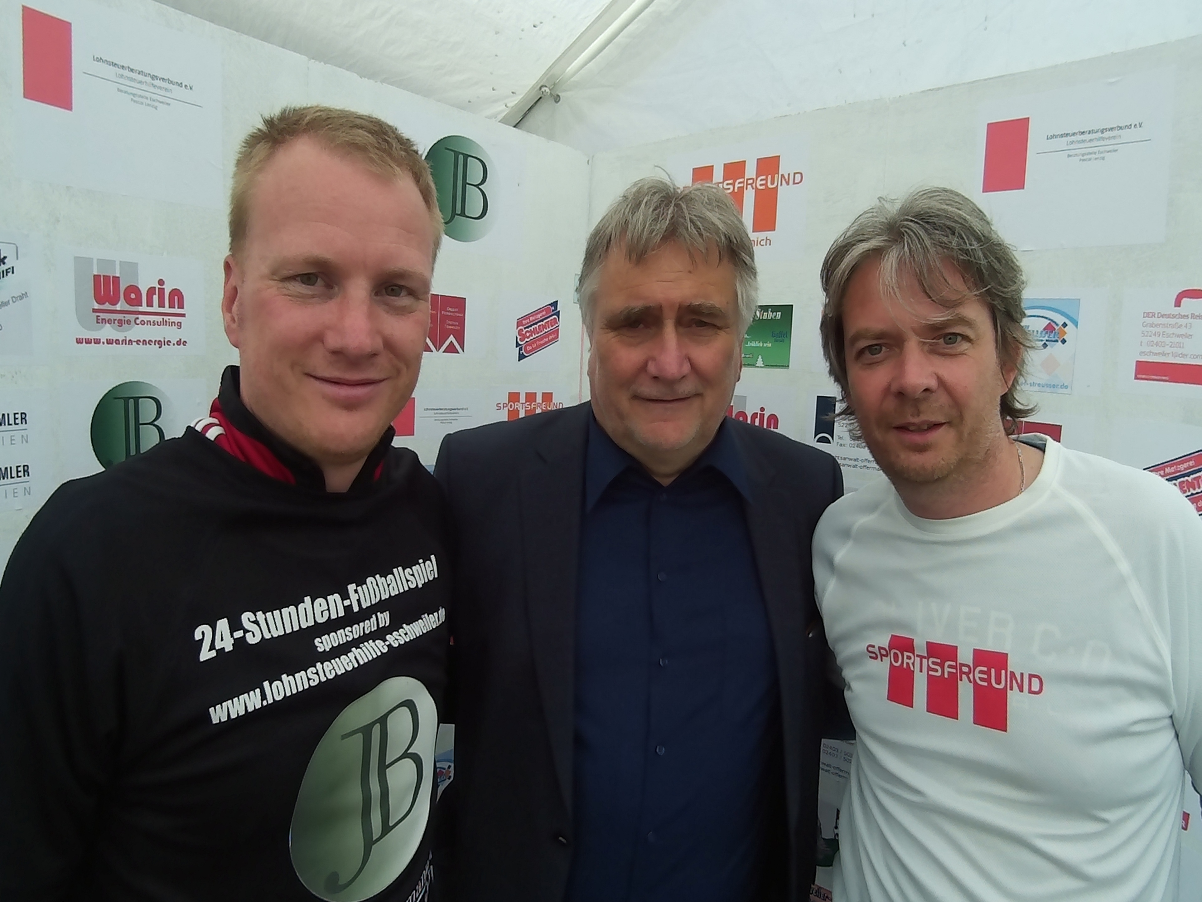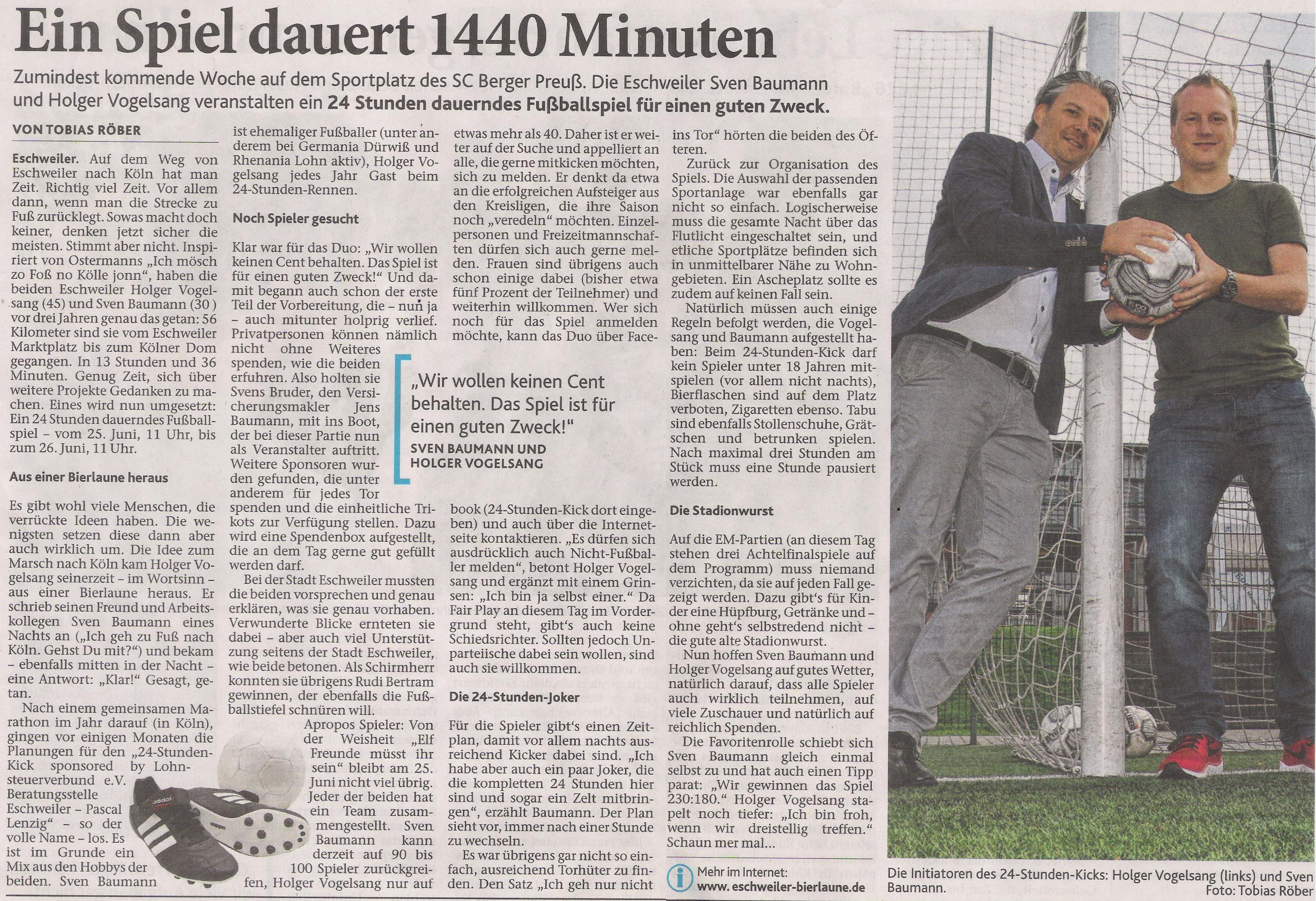 Im Januar 2016 meldete Sven plötzlich und unerwartet: „Ich habe eine Spielstätte. Wann spielen wir?“ Das anvisierte Stadion von Berger-Preuß in Eschweiler Hastenrath bot die besten Voraussetzungen. Etwas von der Bebauung abgelegen und vor ca. einem Jahr wurde das Geläuf von Asche auf Kunstrasen umgebaut. Nach Gesprächen mit der Stadt und dem ansässigen Verein standen alle Ampeln auf Grün. Somit ging es für beide auf die Suche nach einem Team. Hiermit tat sich Sven als Urfußballer deutlich leichter als Holger, der erst mal "nur" Arbeitskollegen und Mannschaftskameraden von Falke Bergrath begeistern konnte. Dieses Problem wurde später durch die Lokalpresse gelöst, die von unserem Vorhaben erfuhr. Der Bericht von Tobi Röber, der in der Tageszeitung und bei FUPA veröffentlicht wurde, ließ die Anmeldezahlen in die Höhe schnellen. Parallel ging es darum Trikots zu besorgen und die Teilnehmer mit dem nötigsten für den Tag zu versorgen. Hierfür fanden sich zahlreiche Sponsoren, die Ihren Beitrag zur Umsetzung leisteten. Nach einigen Monaten Planungsarbeit konnte es in einheitlichen Trikots bei Bier, Limo und Stadionwurst am 25.06.2016 um 11:00 Uhr losgehen. Schnell zeigte sich, wer hier der Fußballer ist. Aber das unterlegene Team biss sich in die Partie und ließ sich nicht abschlachten. Als es bei Holger zu Spielerengpässen kam, halfen sogar Spieler aus Svens Team aus und jedem war klar: "Hier geht es nicht um gewinnen oder verlieren". Wenn wir bis Sonntag 11:00 Uhr durchhalten, gibt es keine Verlierer. Spätestens zum Sonnenaufgang gegen 05:00 Uhr sah man den Mannschaften die Erschöpfung auch aus weiter Entfernung an, da auch bei der hohen Personenanzahl auf jeden Spieler ca. 3,5h Spielzeit anfiel. 10:45 Uhr und alle Spieler stürmen für die letzten 15 Minuten den Platz und am 26.06.2016 ging um 11:00 Uhr eine erfolgreiche Bierlaune zu Ende. Im Nachgang wird noch ein Strich unter die Einnahmen und Ausgaben gezogen, und der Überschuss, wie versprochen, gespendet.